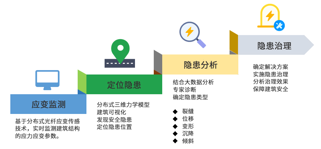 光格建筑結構健康隱患監測系統,基于分布式光纖溫度應變傳感技術(shù),對建筑結構健康隱患進(jìn)行實(shí)時(shí)在線(xiàn)監測,可及時(shí)發(fā)現安全隱患,定位隱患位置,并通過(guò)工程結構分析大數據技術(shù)確定隱患類(lèi)型,如裂縫、位移、變形、沉降和傾斜等,定制專(zhuān)業(yè)解決方案,保障建筑安全。