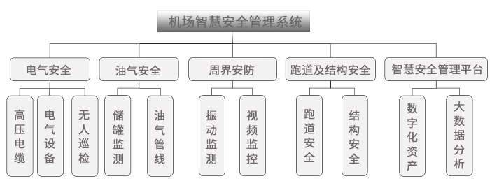 光格機場(chǎng)智慧安全管理系統主要由電氣安全監測系統、油氣安全監測系統、周界安防系統、跑道及結構安全監測系統、智慧安全管理平臺組成。系統基于物聯(lián)網(wǎng)感、傳、知、用技術(shù),實(shí)現機場(chǎng)資產(chǎn)的實(shí)時(shí)安全監測,輔助管理者進(jìn)行科學(xué)決策及運維。